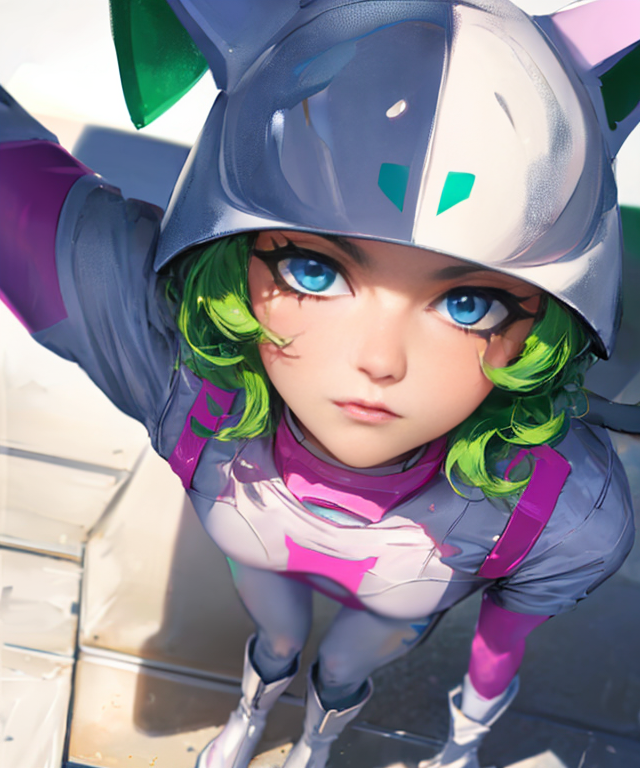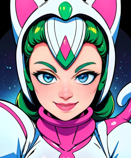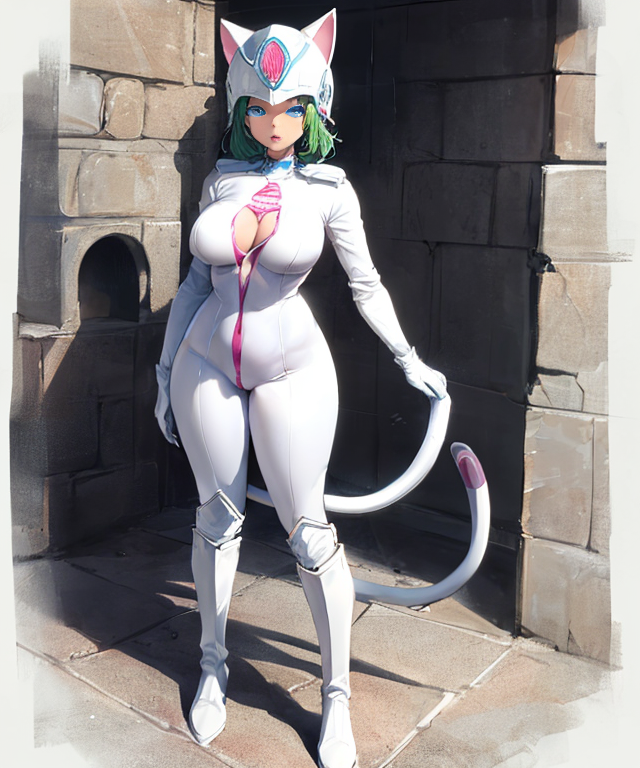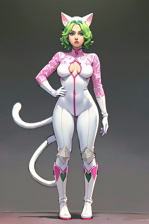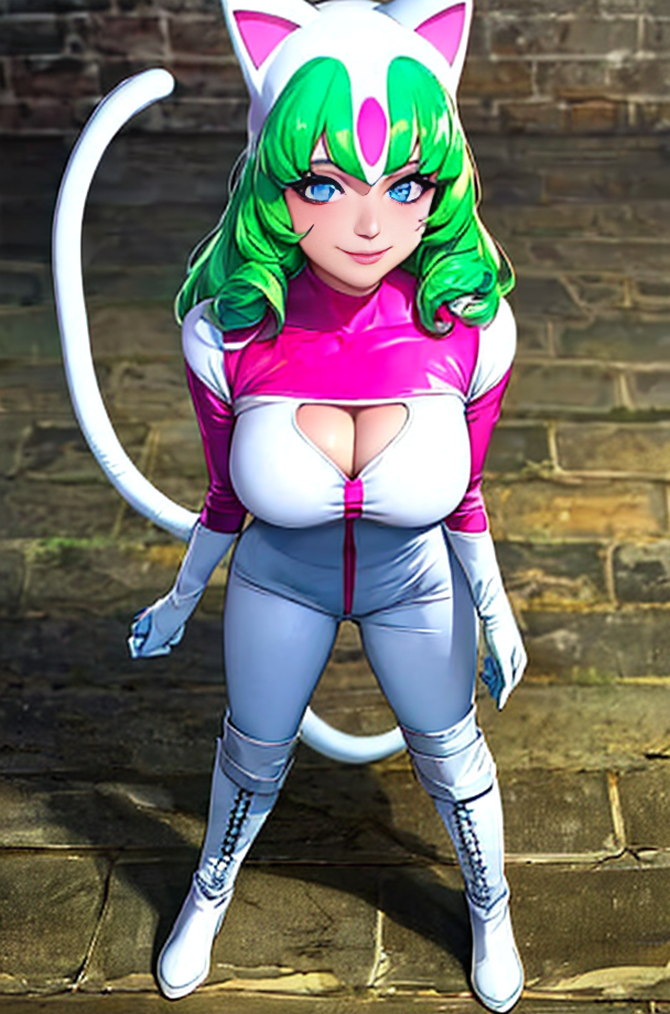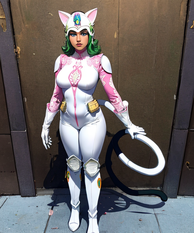 white and pink bodysuit, tail, white helmet with cat ears, white gloves,