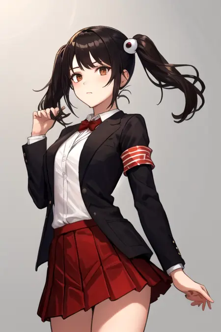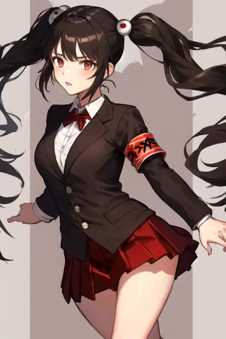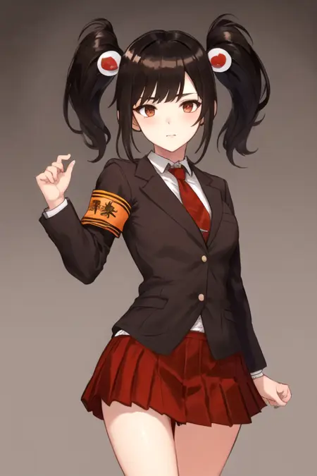 YurikoOmega, 1girl, solo, long hair, miniskirt, red skirt, black hair, hair ornament, twintails, brown blazer, pleated skirt, armband,