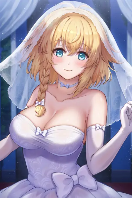 wedding dress, wedding ring, elbow gloves, white gloves, bridal veil, cleavage, jewelry, strapless dress, white dress, choker, bare shouldres, white bow,
