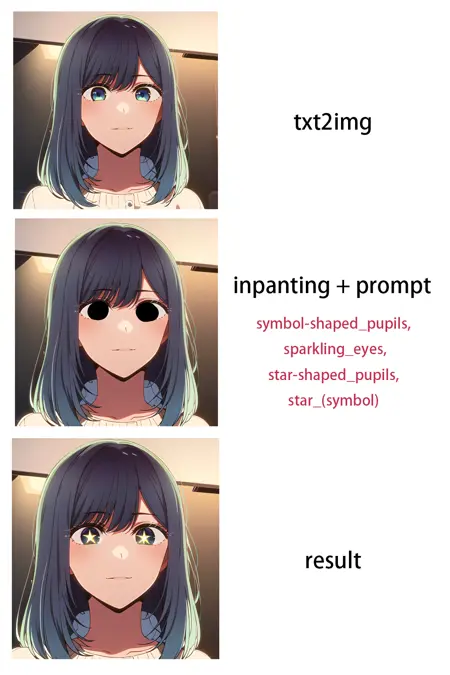 I found that the txt2img results without the starry eyes prompt were not satisfactory during my testing. I suggest not including it initially and using inpainting techniques for further improvement.