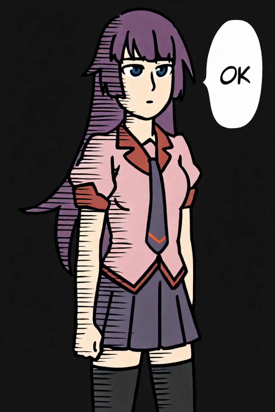 プロンプト1:onepunchman_meme、会話風船、英語のテキスト、ミーム、パロディ、並行線、インパクトライン、パープルグラデーション背景、横顔
