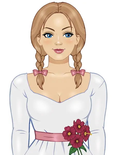 애나벨, 스마일, 1소녀, 드레스, 흰 드레스, 쌍辫, 립스틱, 드레스 위의 꽃, 머리 리본, 파란 눈