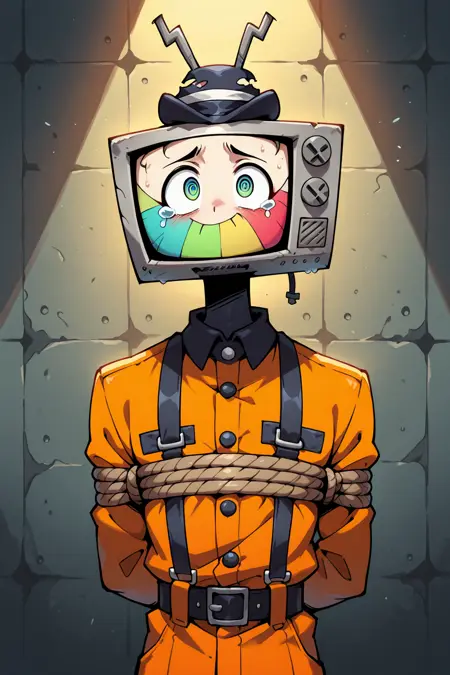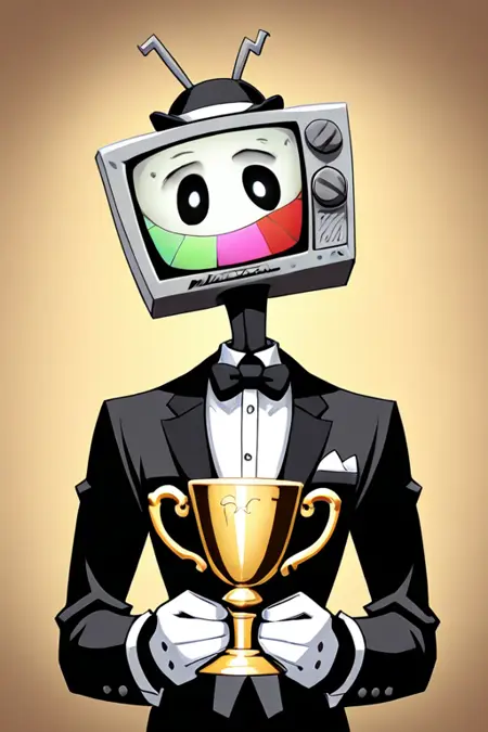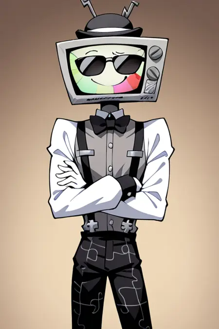 프롬프트: MrPuzzles, TV 헤드, 회색 셔츠, 흰색 소매, 스스펜더, 검정 바지, 리본넥타이, 볼러 모자
