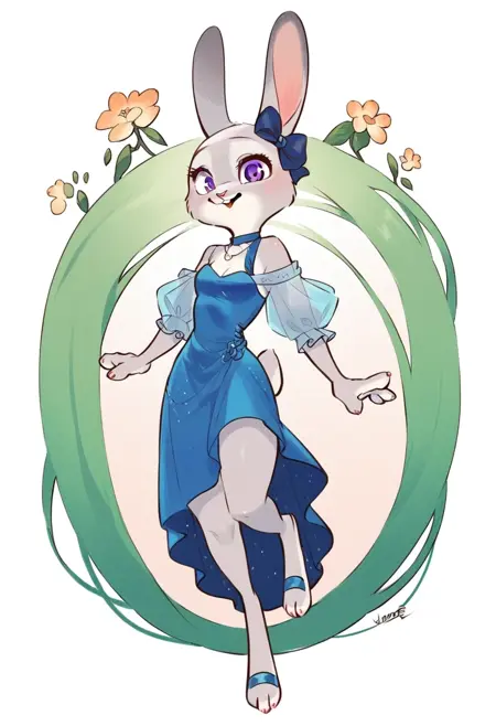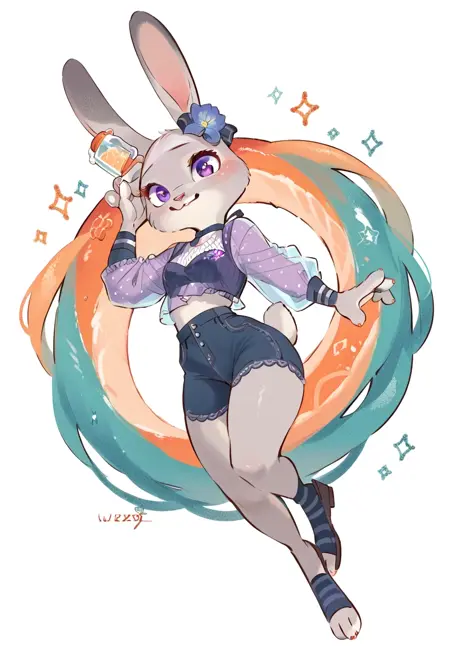 Judy Hopps, rabbit girl, gray fur, purple eyes, rabbit ears, rabbit tail