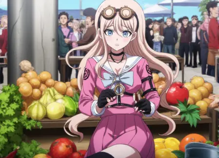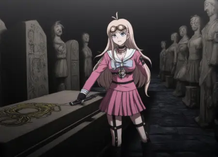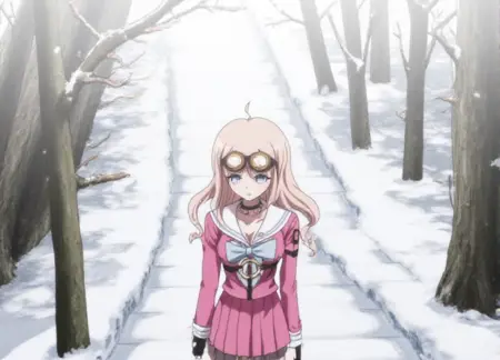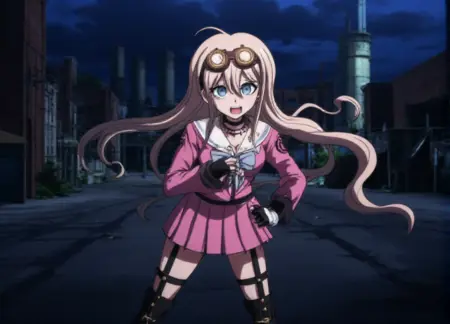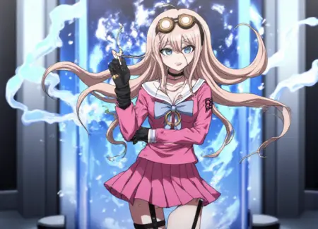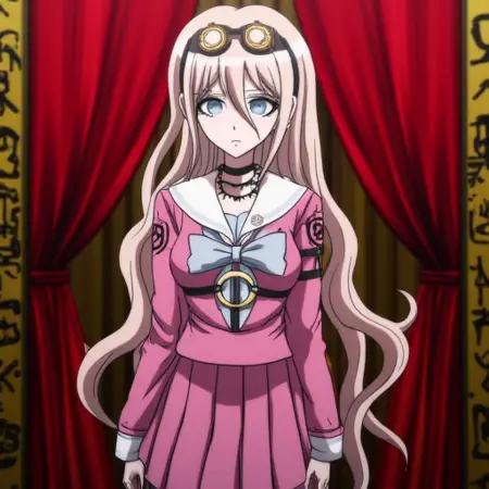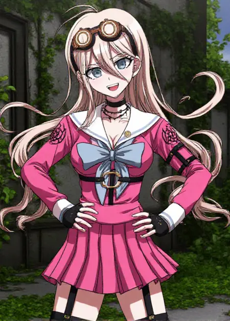 標準服:ミウ・イリマはDanganronpa V3の制服を着用しています。彼女の髪は腰までのストロベリーブロンドで、背中に波打つように流れ、頭頂部には左右に短い髪が立ち上がり、右へ流れております。前髪は長く、風に揺れるように左へ流れており、氷のような青い瞳を持っています。頭部のアクセサリーはゴールドの装飾が施された茶色のゴーグルです。彼女は改良された長袖の濃いピンク色のセイフク制服を着ており、白いセーラー領と袖口には、薄く褪せたパステルブルーの縞模様が入り、襟元には薄いパステルブルーのリボンが結ばれています。胸元のカバーはなく、胸元が露出しています。袖の肩部分には黒い紋章が印刷されています。彼女は制服と同じ濃いピンクの短いプリーツスカートを履き、垂直に白い縞模様が入った膝丈の靴下、ゴールドのバックル、スタッド、ボタンで装飾された黒いヒールブーツを履いています。アクセサリーには、黒いチョーカー、針金のように見える二つのラバーコラーや、銀のスタッドが施された指なしグローブ、ネコのマスコット「ニコニコハッピー」のピンが襟元に着いています。左腕にはゴールドスタッドでつながれた黒いストラップが巻かれており、胴体と脚にはゴールドリングでつながれたゴールドスタッド付きの黒いストラップが巻かれています。長く黒いブーツは膝まで届いています。