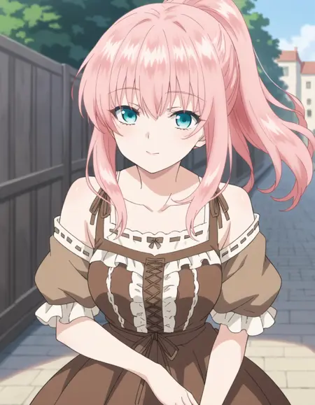 (brown_dress,lace_up_front,ponytail,plunking_neckline,:1.0),