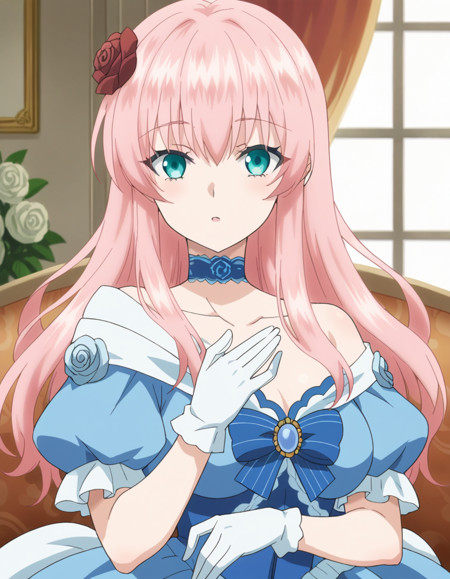 (puffy_sleeves,blue_formal_dress,plunking_neckline,blue_lace_choker,rose,brooch,bowtie,white_gloves,:1.0),