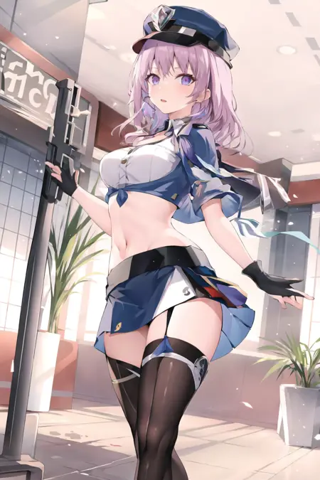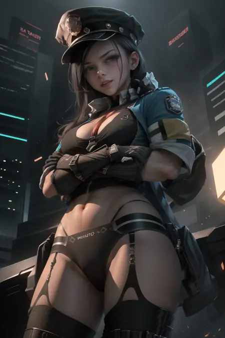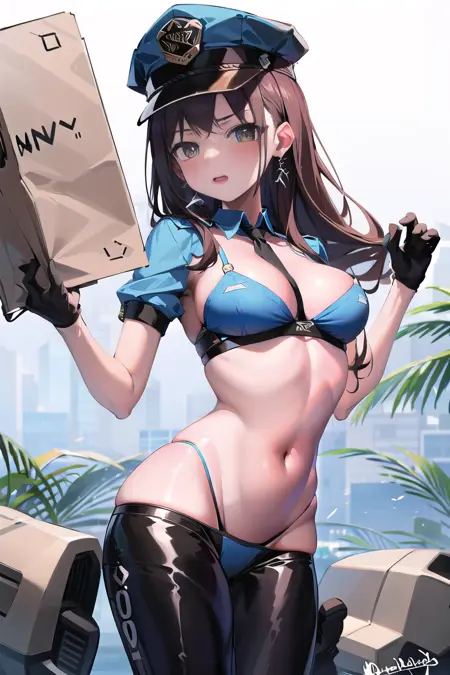 手套,无指手套,乳沟,警服,警察,制服,腰带,女警,紧身衣,警帽,尖顶帽,过膝袜,渔网袜,裙子,渔网过膝袜,上衣,短袖,铅笔裙,迷你裙,露脐上衣,高跟鞋,乳沟间的领带,内裤,靴子,耳环,首饰,大腿靴,泳衣,短款夹克,高腰比基尼,夹克,下胸露,高腰,大腿带,单只手套,皮肤压痕,不对称比基尼,短裤,超短裤,长袖,穿孔,肚脐穿孔,袖口,服饰 所有这些元素在训练数据集中都有较充分的出现。