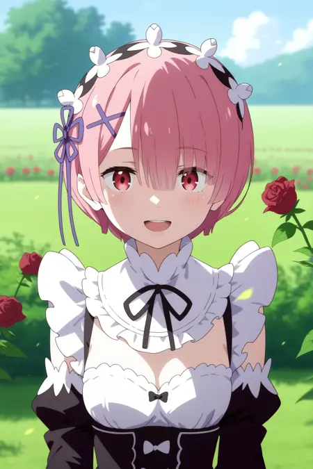 触发词:1girl,solo,ram,roswaal mansion maid uniform,short hair,maid,(hair over one eye),hair ornament,red eyes,detached sleeves,x hair ornament,ribbon,aid headdress