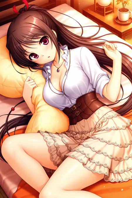 shirt,dress,blouse,white shirt,frills,sleeves rolled up,corset,belt,skirt,brown skirt,layered skirt,necklace,pendant,jewelry,