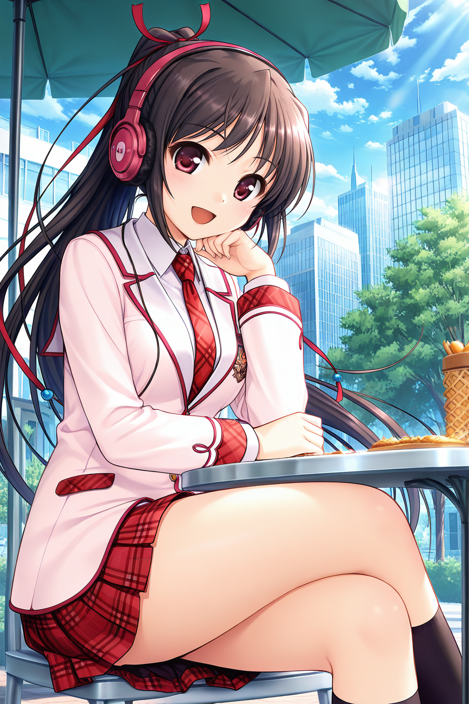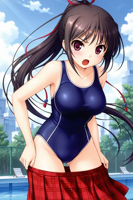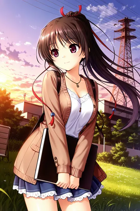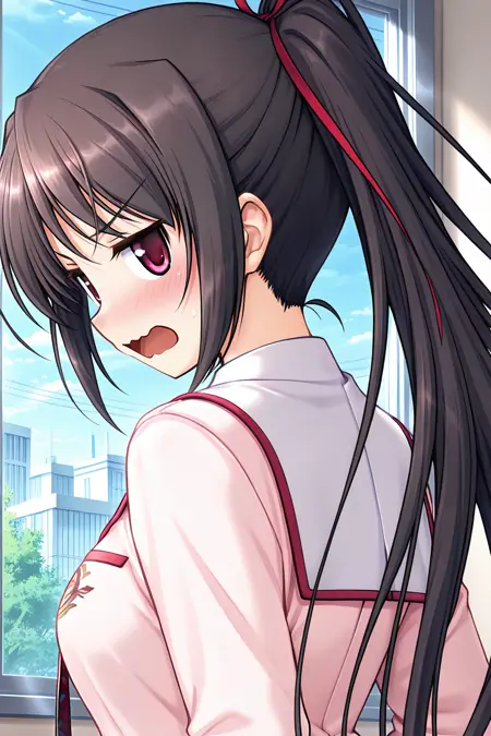 sakuraba tamamo,red eyes,brown eyes,black hair,brown hair,long hair,ponytail,ribbon,hair ribbon,red ribbon,
