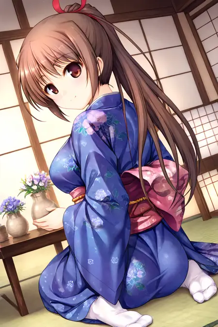 japanese clothes,kimono,blue kimono,long sleeves,obi,sash,floral print,tabi,socks,
