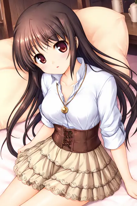 shirt,dress,blouse,white shirt,frills,sleeves rolled up,corset,belt,skirt,brown skirt,layered skirt,necklace,pendant,jewelry,