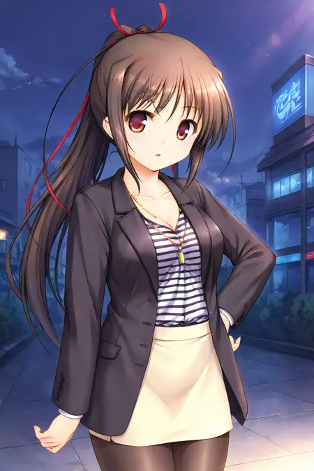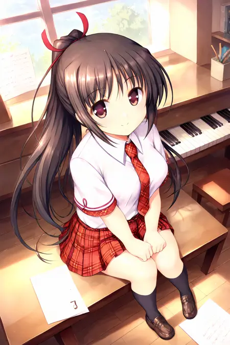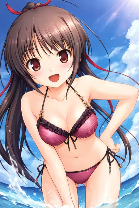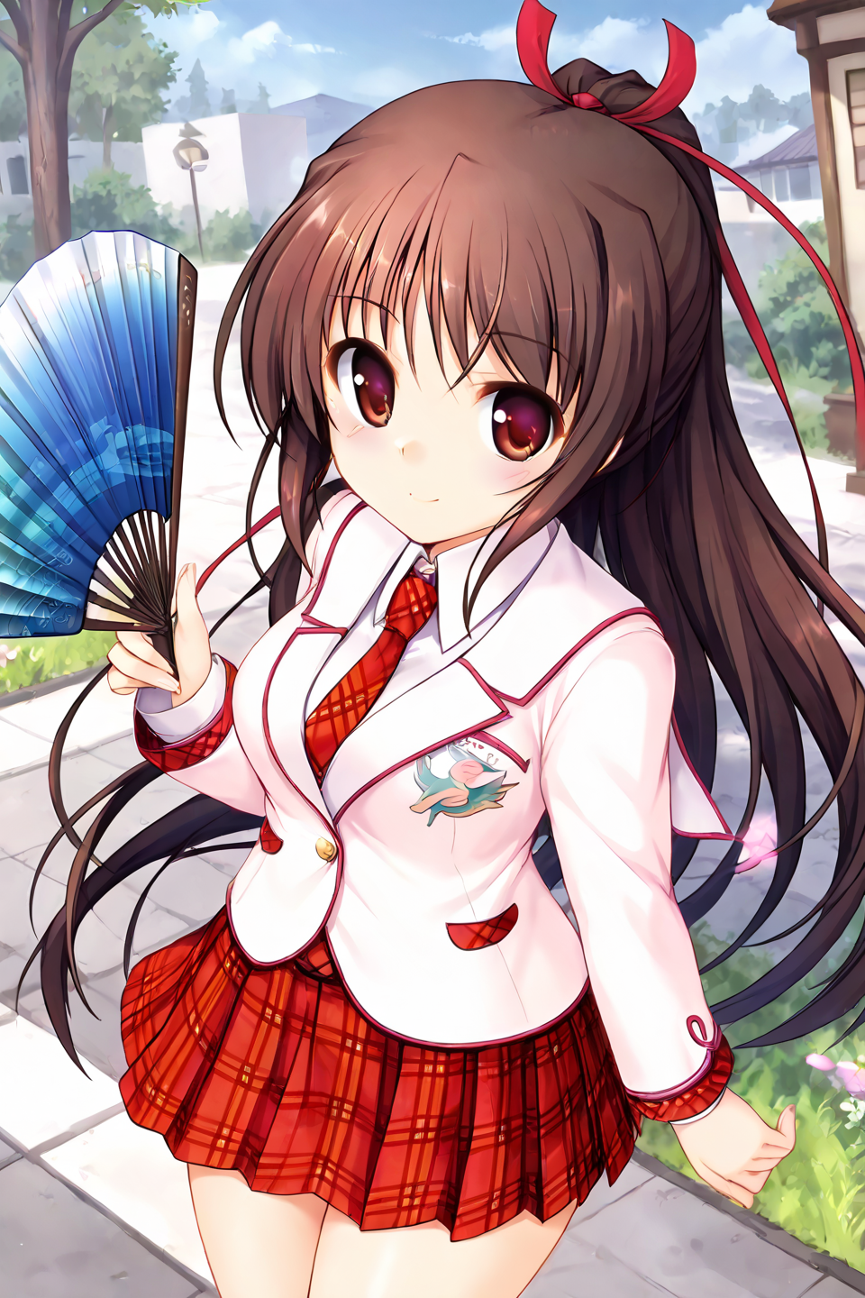 sakuraba tamamo,red eyes,brown eyes,black hair,brown hair,long hair,ponytail,ribbon,hair ribbon,red ribbon,