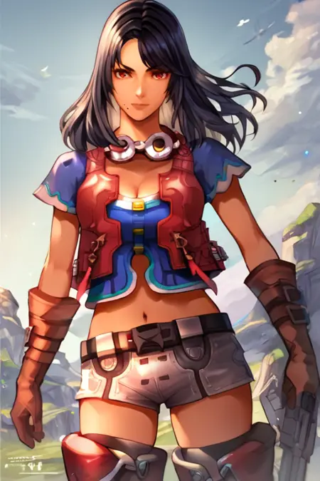 彼女の衣装: 青いシャツ、胸元、赤いベスト、へそ、首にパイロット用ゴーグル、赤い手袋、手袋にベルト、白いショーツ、ベルト、太もも丈ブーツ、黒いブーツ