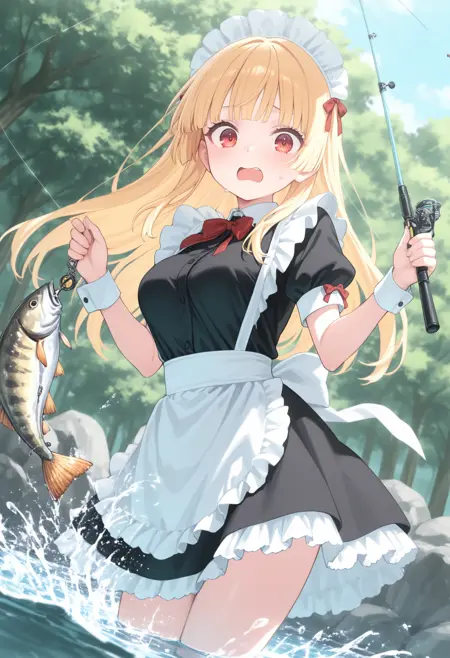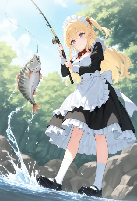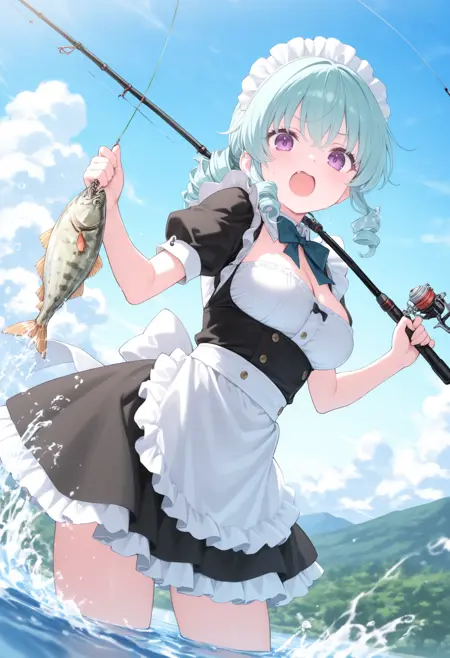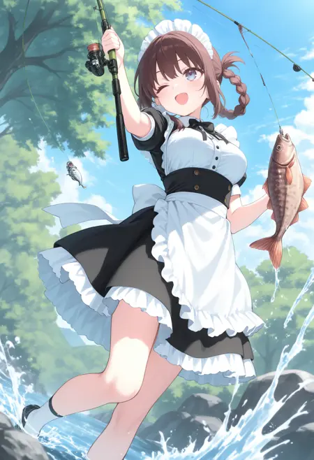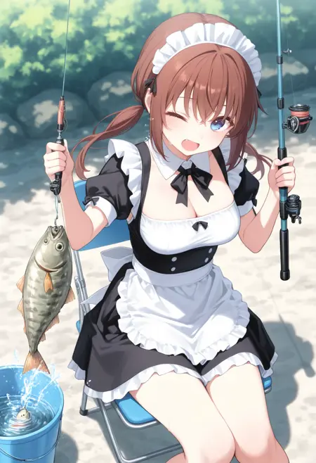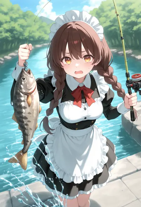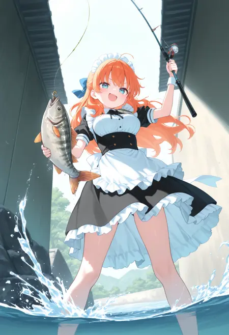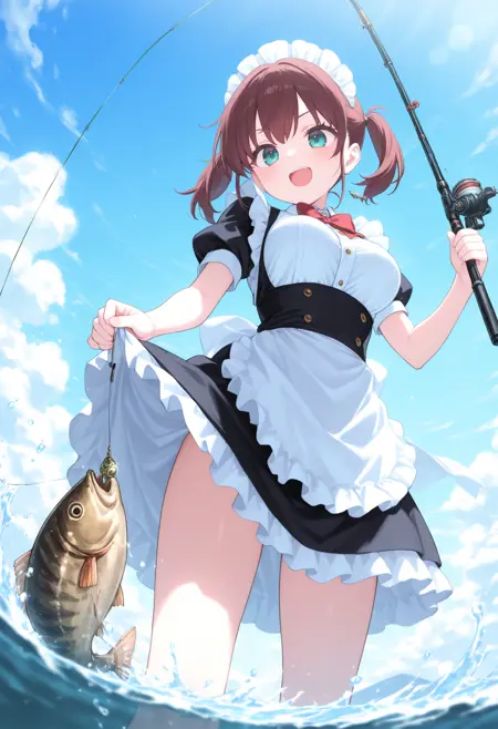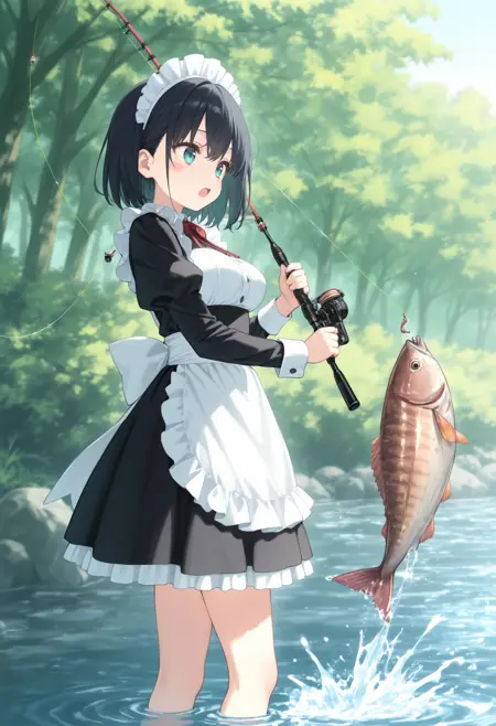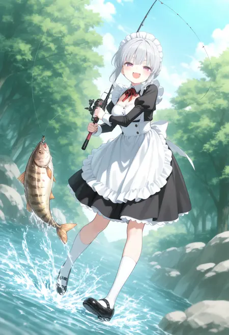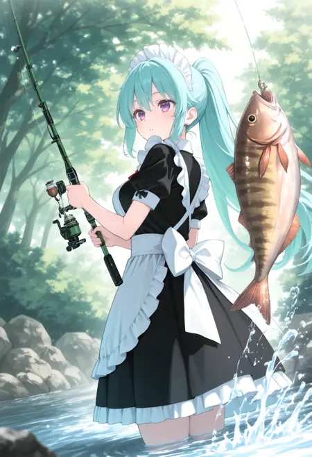 Since Illustrious has already learned how to put itself in a fishing position waiting for a fish to be caught, we assume two patterns after the fish is caught. In addition to the trigger, fishing rod, fish, holding fishing rod, water, fishing line, splashing, etc. can be added to make it look pulled up. You can also add “arms up,” “dynamic pose,” or “holding fish,” and “holding animal” to show off the fish you've caught.