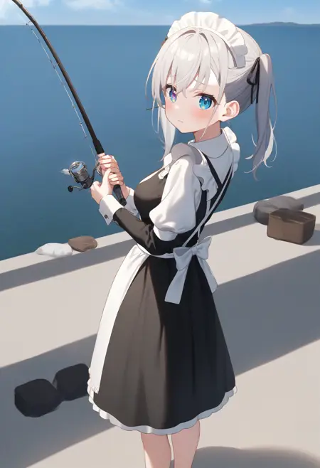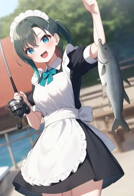 由于Illustrious已学习过等待鱼上钩的钓鱼姿态,因此我们设想了鱼被钓上来后的两种场景。在触发词基础上,加入fishing rod、fish、holding fishing rod、water、fishing line、splashing等关键词,即可呈现鱼被拉起的姿态。也可以尝试添加arms up、dynamic pose等。进一步加入holding fish、holding animal,则可表现为展示手中钓到的鱼的姿态。
