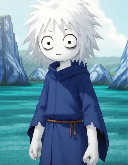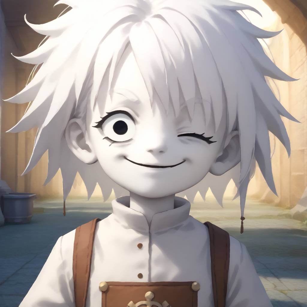 blevzgt, colored skin, short hair, white skin, solo, white hair, messy hair, (solid circle eyes:1), black eyes