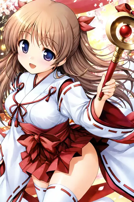 japanese clothes, miko, wide sleeves, red ribbon, ribbon trim, ribbon-trimmed sleeves, skirt, hakama, hakama skirt, hakama short skirt, red hakama, zettai ryouiki, thighhighs, white thighhighs, ribbon-trimmed legwear, bow,