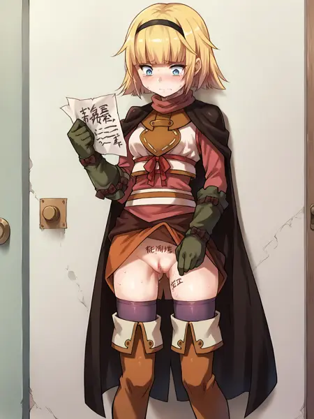 服装:粉色衬衫黑色发带橙色裙子,Arche_Eeb,棕色斗篷,皮制胸甲,长袖,绿色手套,弓形手套,白色短款夹克,白色腰带,迷你裙,裙子在衬衫下,紫色腿部服饰,橙色鞋履,大腿靴