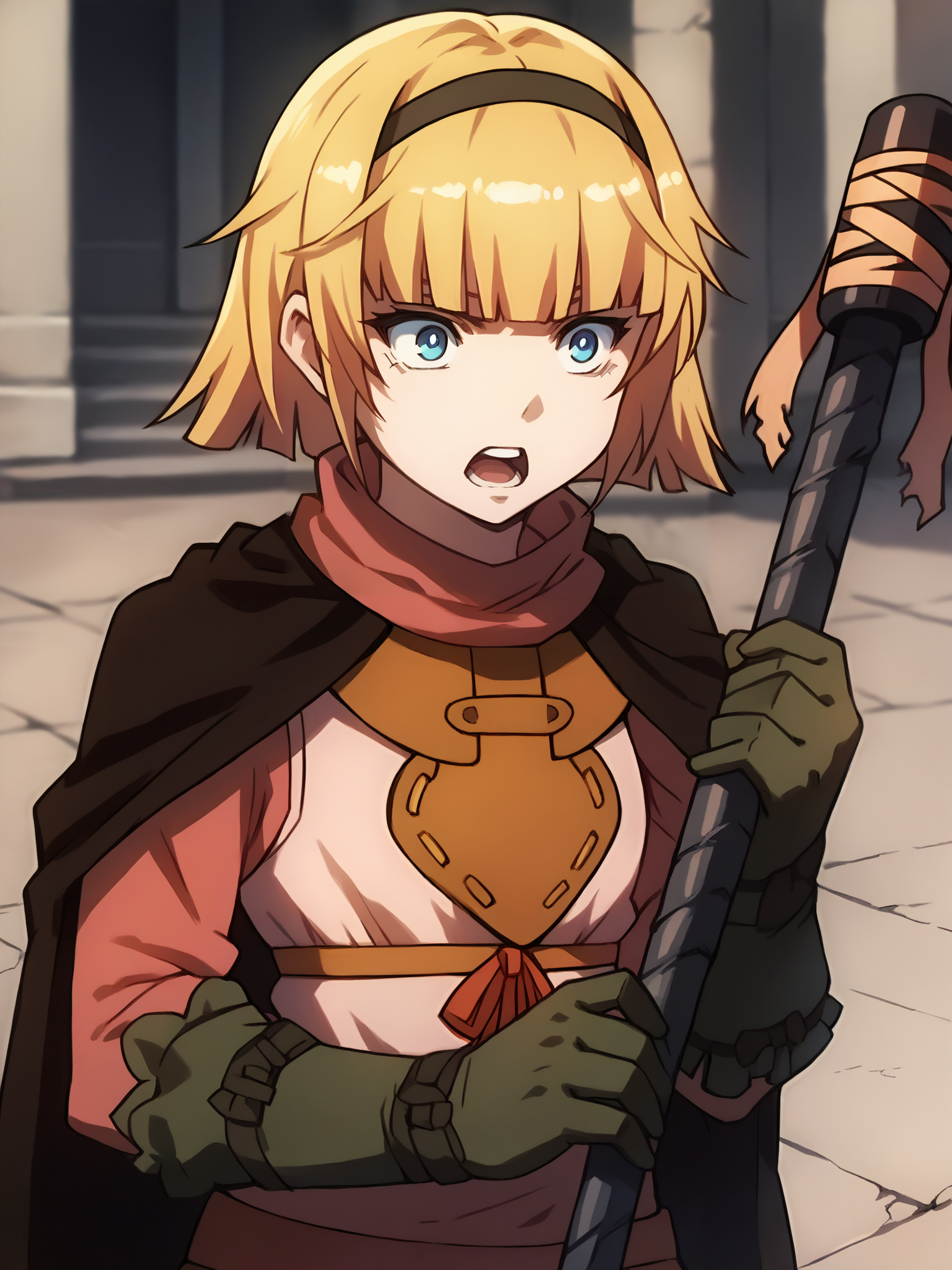 Outfit: pink_shirt_black_hairband_orange_skirt, Arche_Eeb, brown_cloak, leather_breastplate, long_sleeves, green_gloves, bows_gloves, white_cropped_jacket, white_sash, miniskirt, skirt_under_shirt, purple_legwear, orange_footwear, thigh_boots