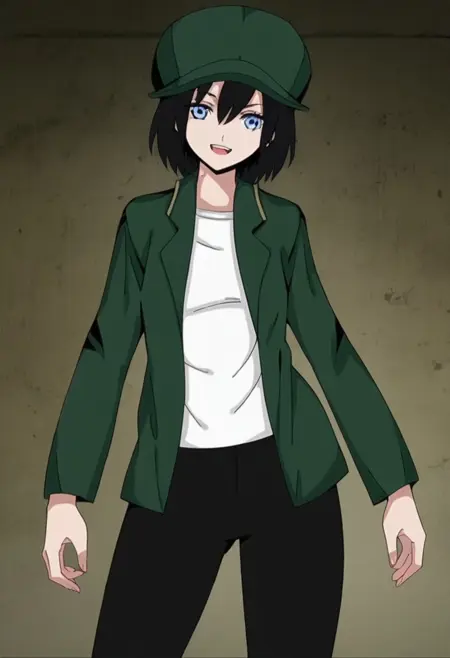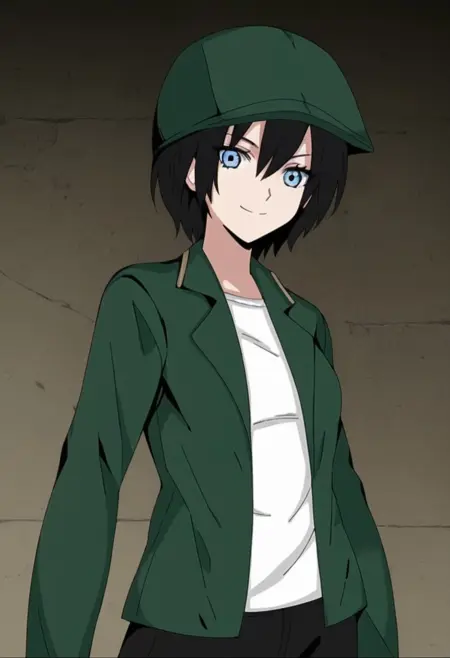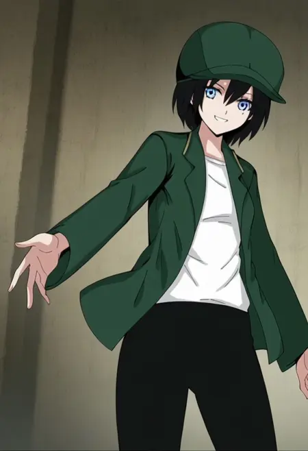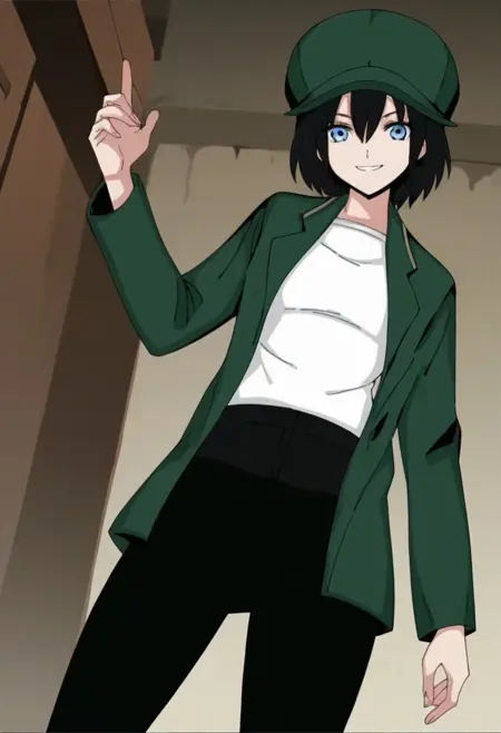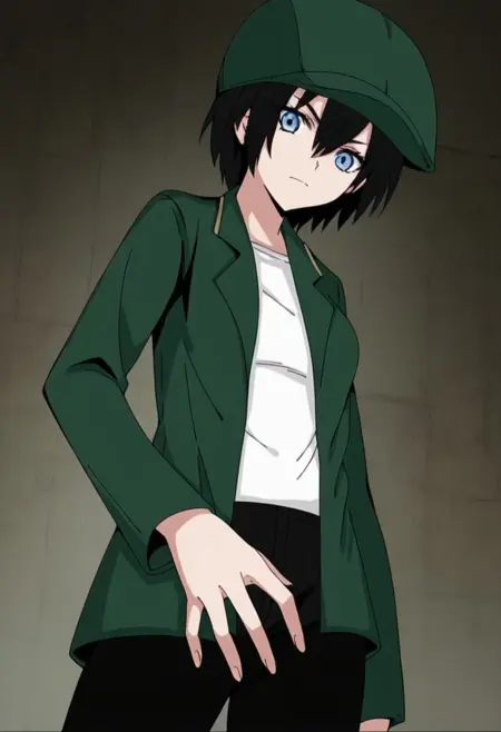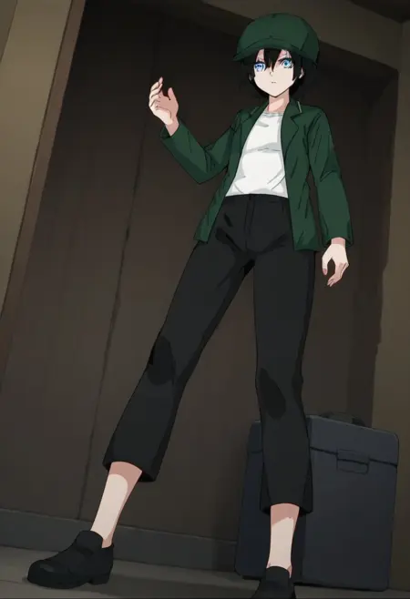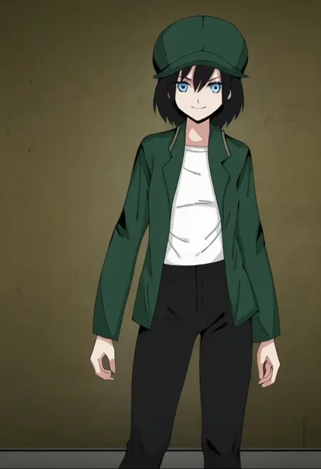 옷: 녹색 자켓, 녹색 머리장식, 열린 옷, 열린 자켓, 모자, 셔츠, 흰색 셔츠, 바지, 검은 바지, 검은 신발,