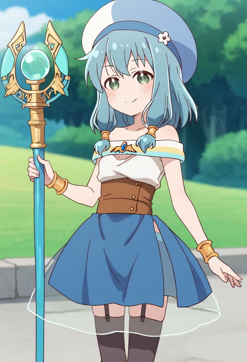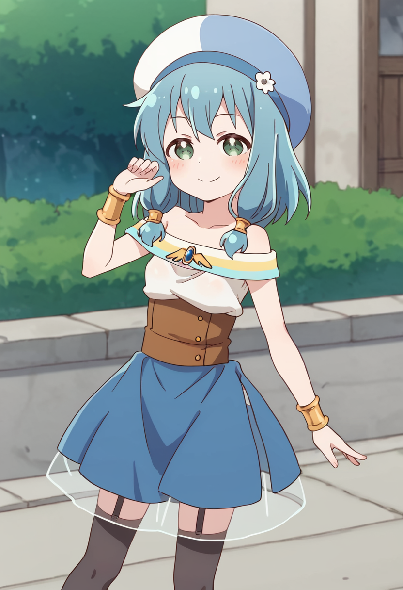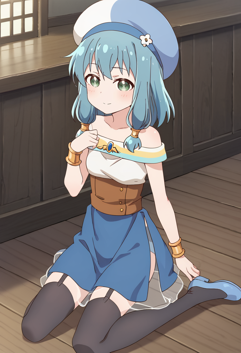 mei-default,meiza endust,green eyes,blue hair,medium hair,beret,white shirt,off shoulder,blue skirt,side slit,see-through,corset, black thighhighs,garter straps, blue footwear,bracelet