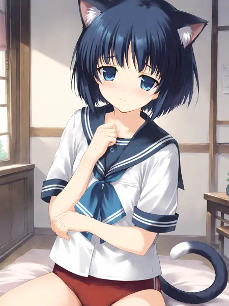 cat ears, black cat ears, school uniform, dress, sailor dress, white shirt, (no pants:1.2), buruma, red buruma,