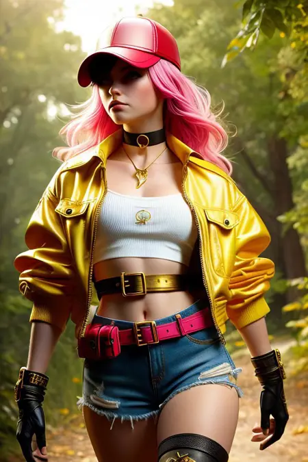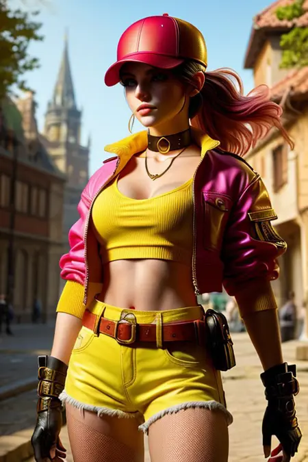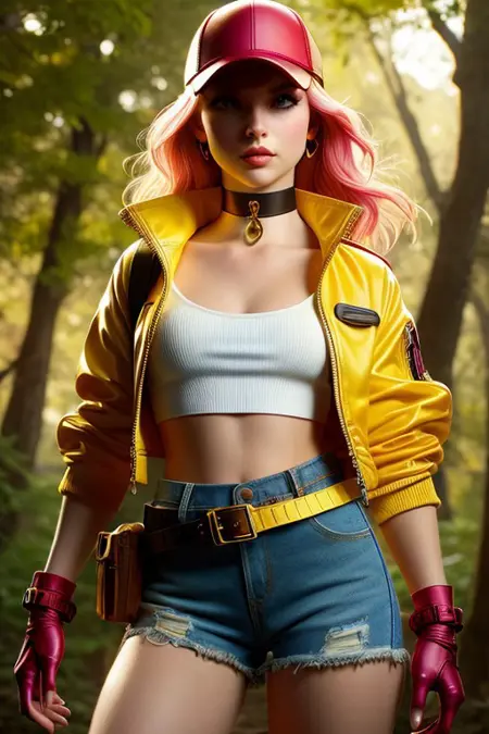 fantasy attire, red cap, yellow cropped jacket, pink top, denim shorts, black gloves, black choker, utility belt, thigh-high boots