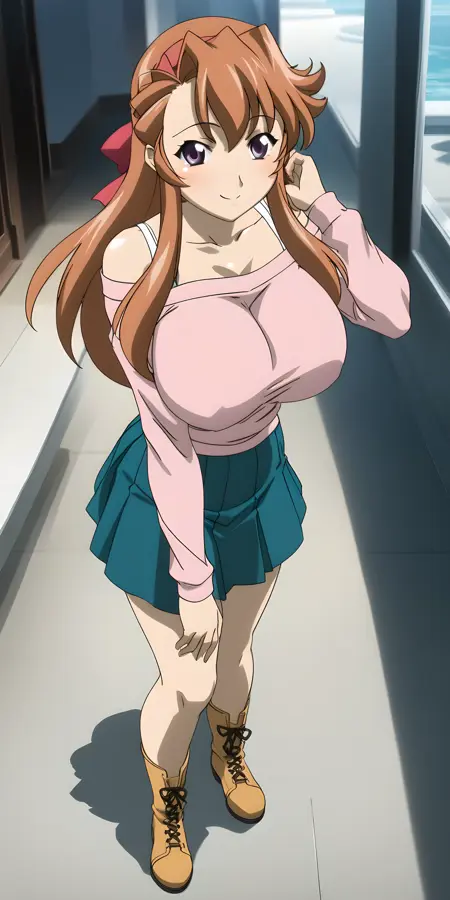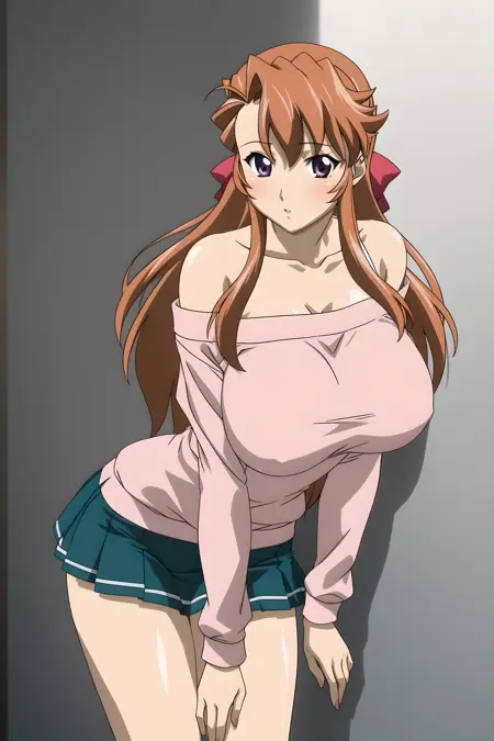 Activation tag is "miori_ai, orange hair, long hair, bangs, purple eyes, huge breasts," Outfit tag is "pink sweater, collarbone, off shoulder, blue skirt, pleated skirt, yellow boots," Maid outfit is "maid, white thighhigh, " underwear is "underwear, blue underwear, "