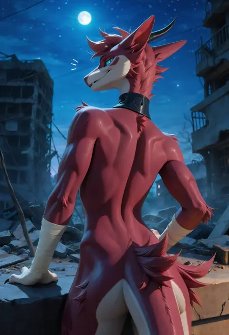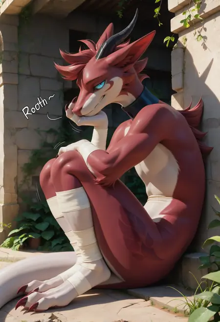 // Illustrious: z3phyr, furred dragon, solo, anthro, blue eyes, claws, furry, hi res, male, no humans, tail, colored sclera, bandages, outdoor, single horn, red claws, collar