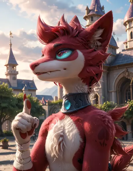 // Illustrious: z3phyr, furred dragon, solo, anthro, blue eyes, claws, furry, hi res, male, no humans, tail, colored sclera, bandages, outdoor, single horn, red claws, collar