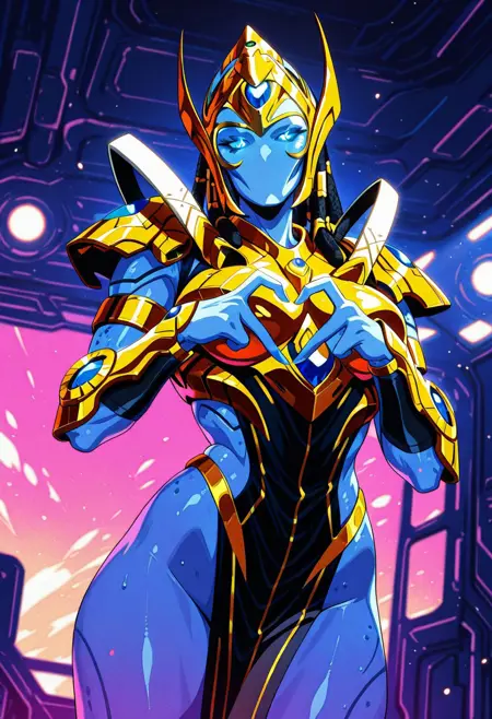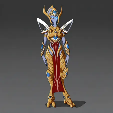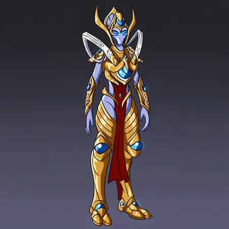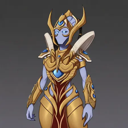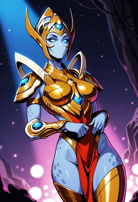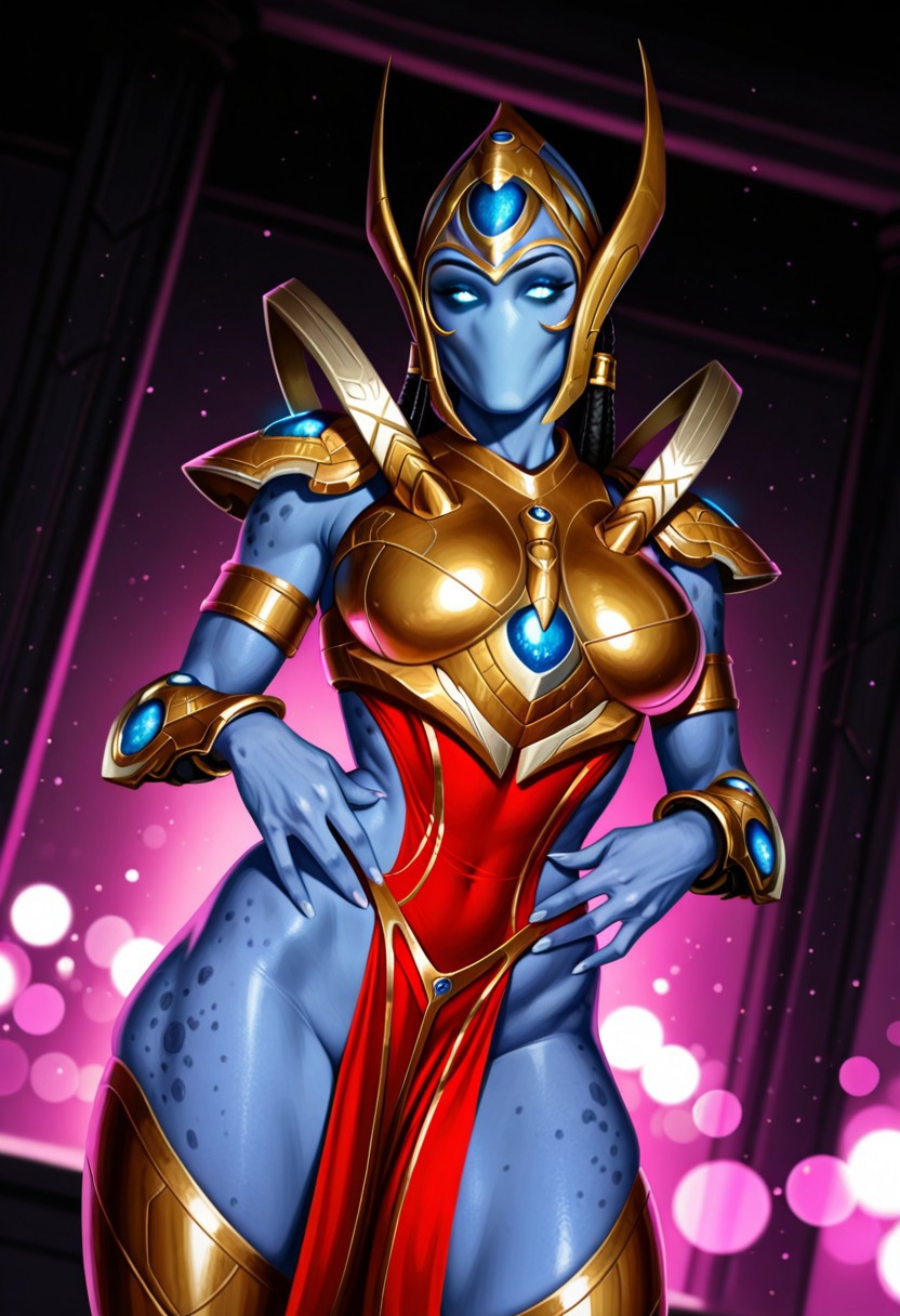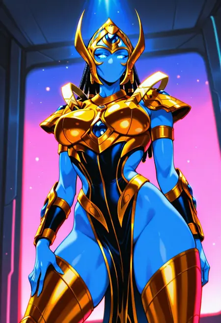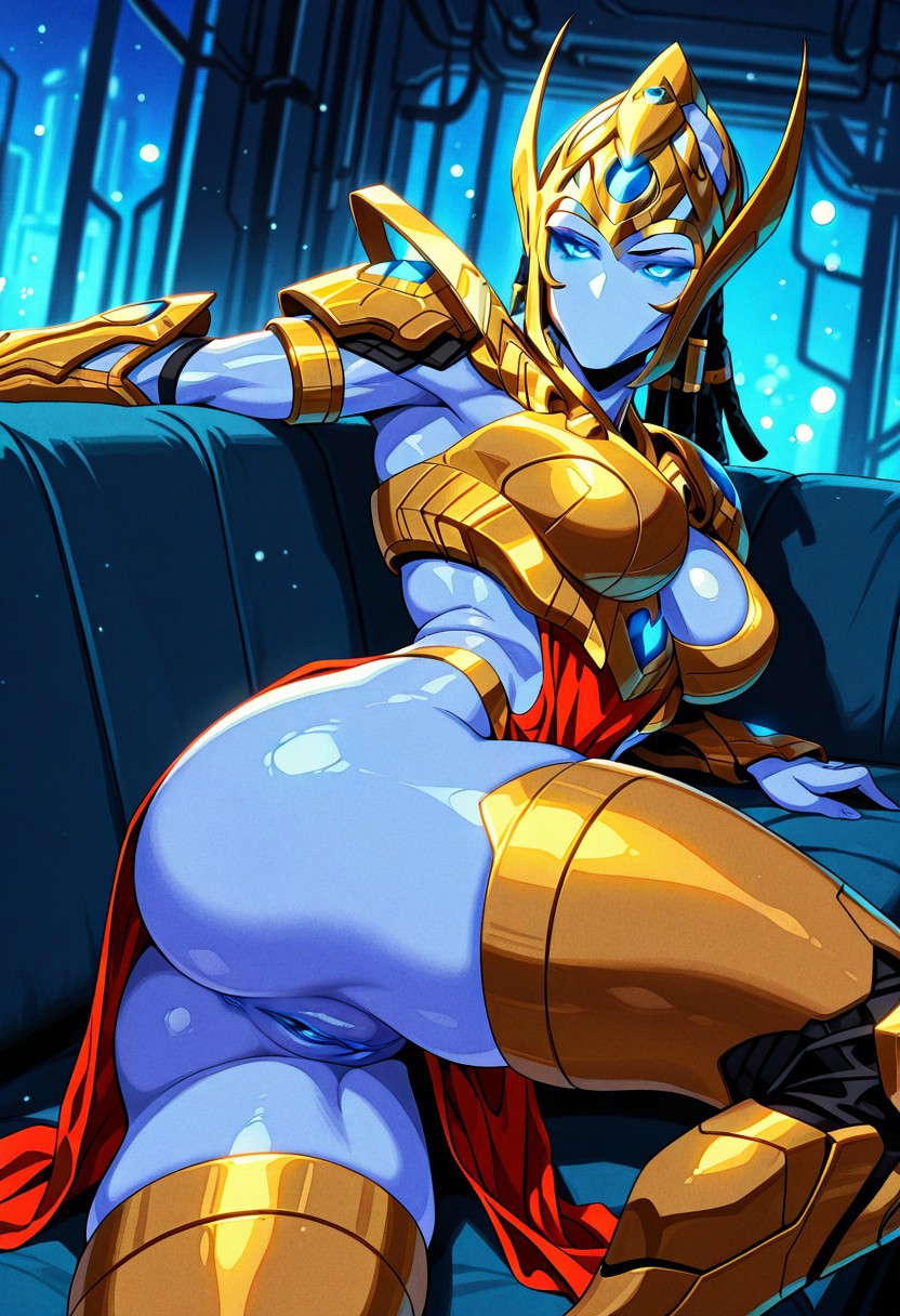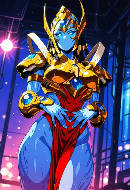 SelendisSC、1girl、solo、protoss、エイリアンガール、エイリアン人型、モンスターガール、口なし、鼻なし、耳なし、色付き肌、青い肌、細長い頭、ヘルメット、黒いダレロック、光る目、青い目、黄金の鎧、大きな胸、肩甲板、赤い骨盤カーテン、胸当て、パウルドロン、ヴァンブレース