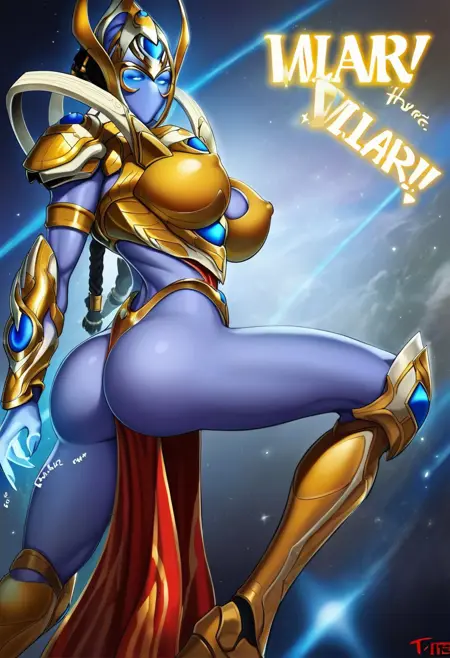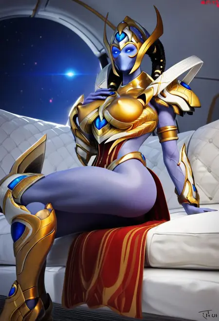 SelendisSC, 1girl, solo, protoss, alien girl, alien humanoid, monster girl, no mouth, no nose, no ears, colored skin, blue skin, elongated head, helmet, black dreadlocks, glowing eyes, blue eyes, golden armor, large breast, shoulder armor, red pelvic curtain, breastplate, pauldrons, vambraces,