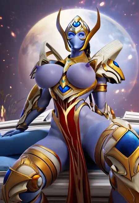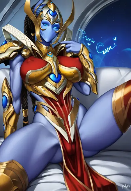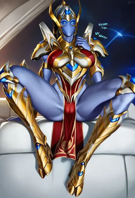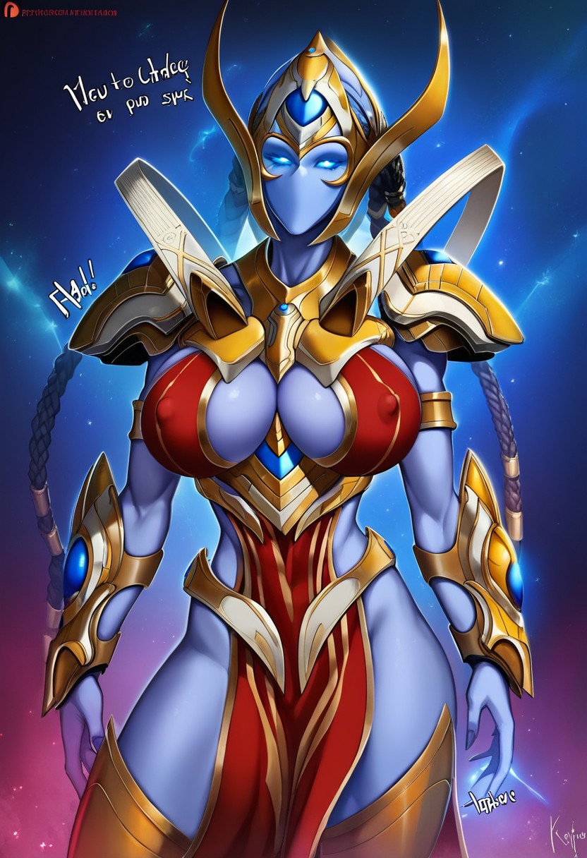 SelendisSC, 1girl, solo, protoss, alien girl, alien humanoid, monster girl, no mouth, no nose, no ears, colored skin, blue skin, elongated head, helmet, black dreadlocks, glowing eyes, blue eyes, golden armor, large breast, shoulder armor, red pelvic curtain, breastplate, pauldrons, vambraces,