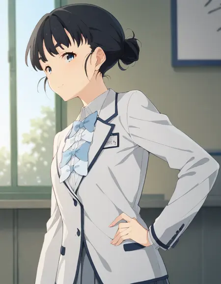 winter school uniform, white blazer, white collared shirt, long sleeves, cyan bowtie, white bowtie, (name tag:0.6), grey pleated skirt, (long skirt:0.8), black pantyhose, white footwear