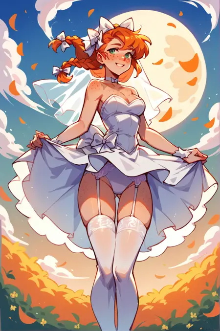 Ann, Harvest Moon, fair skin, freckles, orange hair, braid, white hair bow, yellow t shirt, denim overalls,