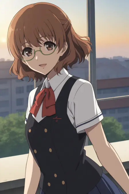 sakuragi yukari, brown hair, short hair, orange hair bow, brown eyes, green semi-rimless eyewear, yukarischoolsummer, school uniform, short sleeves, black vest, white shirt, collared shirt, red neckerchief, school emblem, blue skirt, pleated skirt, black kneehighs, loafers