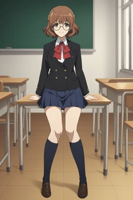 sakuragi yukari, brown hair, short hair, orange hair bow, brown eyes, green semi-rimless eyewear, yukarischoolwinter, school uniform, blazer, long sleeves, black jacket, white shirt, collared shirt, red neckerchief, school emblem, blue skirt, pleated skirt, black kneehighs, loafers