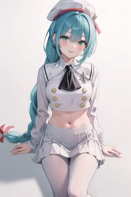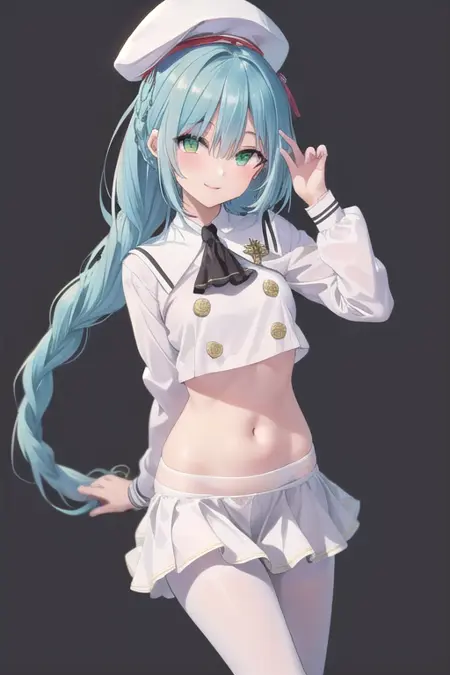 1girl, green eyes, white beret, white miniskirt, braid, very long hair, white pantyhose, one eye covered