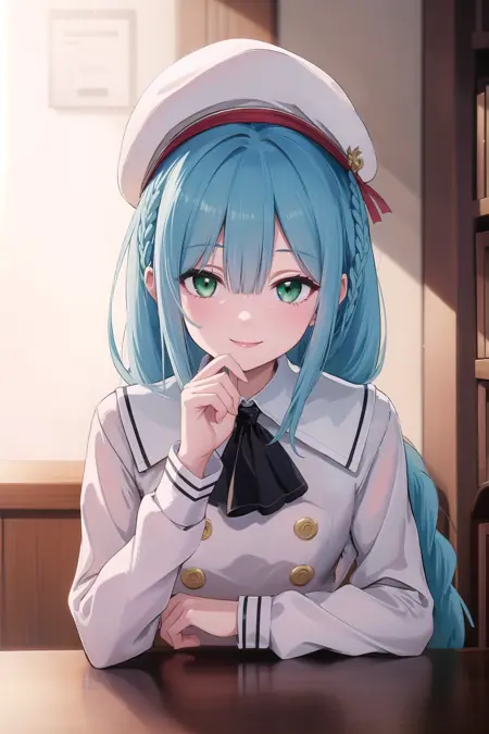 blue hair, very long hair, green eyes, white beret, one eye covered