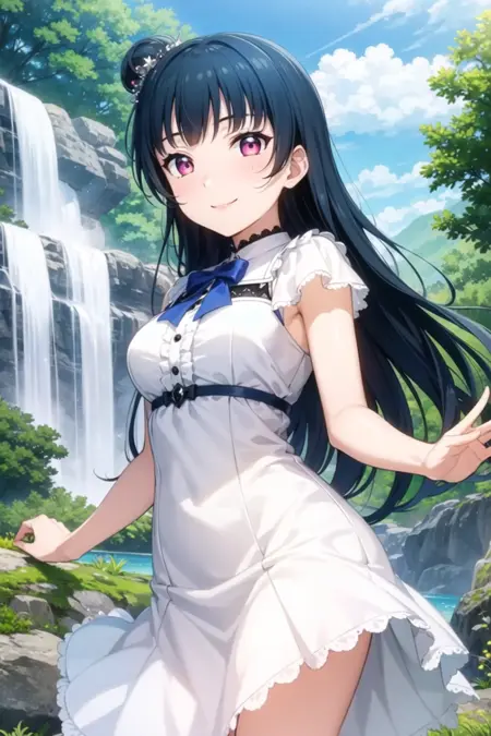 使用するタグ: 1girl, solo, tsushima yoshiko, purple eyes, blue hair, single hair bun (or single side bun), long hair,