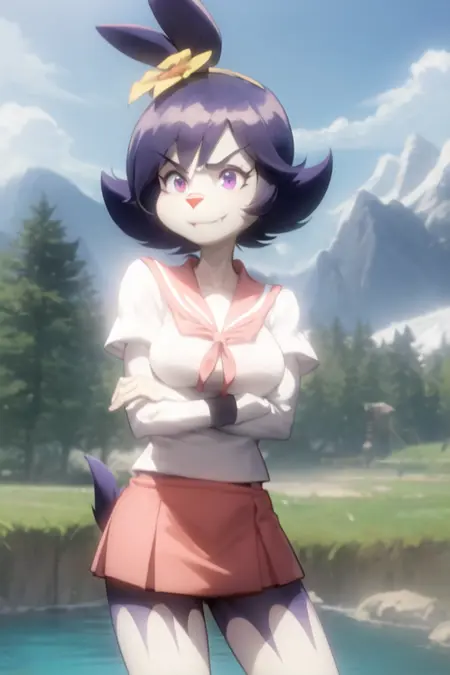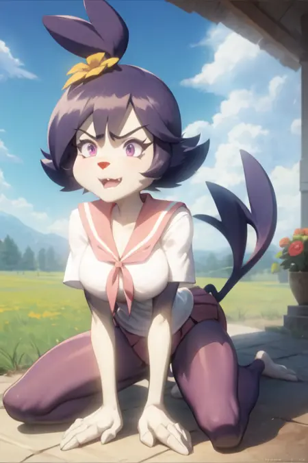 그녀를 불러내려면 포유류 여성, dot_warner_shoujo 를 사용하고, 머리를 만들기 위해 짧은 머리, 앞치마, 꽃, 헤어 액세서리, 보라색 눈, 동물 귀 를 사용하세요. 몸체는 체모, 꼬리 를 사용해 형성하고, 옷은 스쿨 유니폼, 세라후쿠, 짧은 치마, 분홍 치마를 사용해 소환하세요.