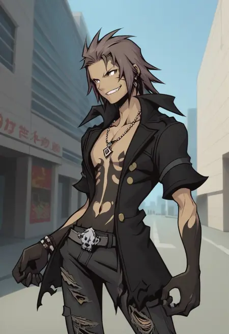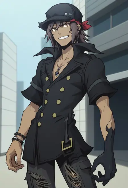 minamoto, 1boy, solo, male focus, brown hair, yellow eyes, dark skin, dark-skinned male, hat, black headwear, bandana, shirt, buttons, bracelet, necklace, pants, torn pants, torn clothes, glove, gloves, black gloves, single glove, boots, black footwear.