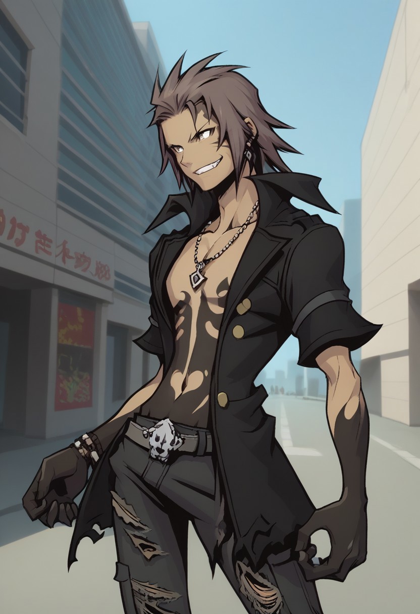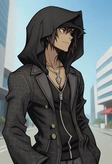 minamoto, 1boy, solo, male focus, brown hair, yellow eyes, dark skin, dark-skinned male, hood, hood up, black headwear, necklace, jacket, zipper, coat, black jacket, black coat, belt, pants, socks, black footwear, boots, cross-laced footwear