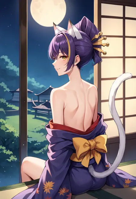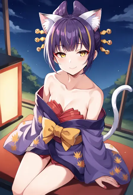 紫髪、短髪、多色髪、ストライプ髪、黄色い目、動物の耳、猫耳、猫の尾、髪飾り、髪止め、ネイルポリッシュ