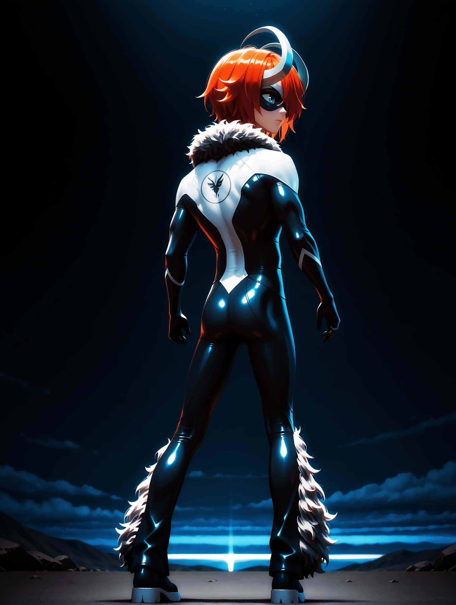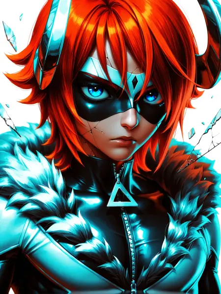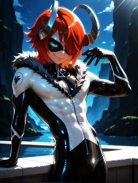 触发词:imtdcaprikid, 1boy, red hair, horns, mask, domino mask, short hair, hair over one eye, gloves, blue eyes, bodysuit, fur trim, white gloves