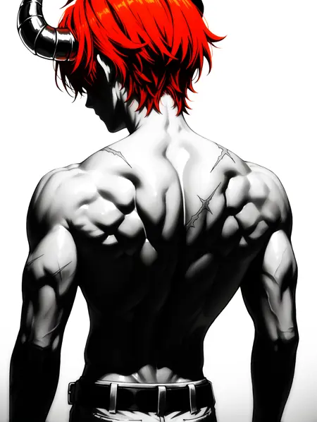 Caprikid S6 提示词:1boy, male, manly, toned male, horns, short hair, orange hair, red hair, blue eyes, hair over one eye