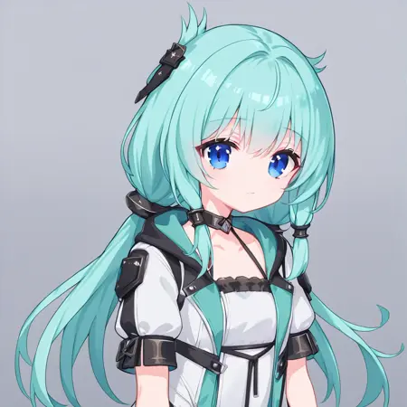 osiris the innocence, aqua hair, blue eyes, low twintails, open jacket