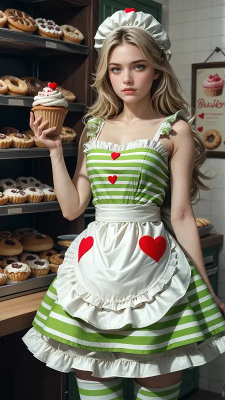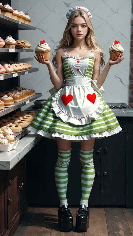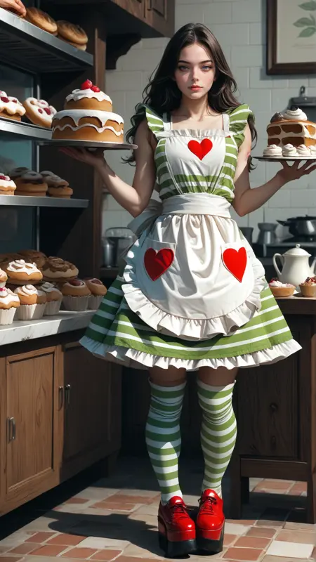 reij-limehearted, white dress, green stripes, white ribbin, heart pattern, white stockings with green strips, red platform shoes